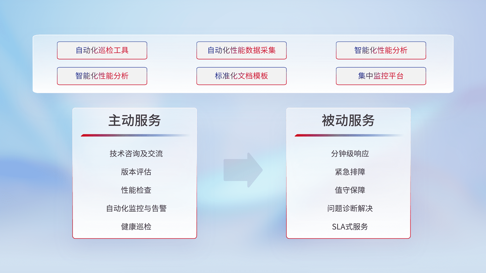 智能化工具和标准化文档,,,保障服务质量,,,提供主动服务(包含技术咨询、、、、版本评估、、、性能检查、、、自动化监控与告警、、、健康巡检)和被动服务包含(分钟级响应、、、紧急排障、、、值守保障、、问题诊断解决、、、SLA服务)。。